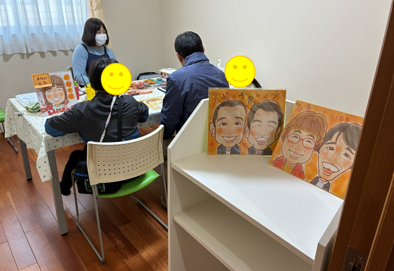 また、似顔絵師、藤下さんが来てくださいました。家族や兄弟で明るい色づかいの優しいタッチの絵を描いてもらいました。それぞれの特徴や雰囲気を絵に落としてもらい、親子の笑顔が広がっていて、私たちも心がほっこりしました。